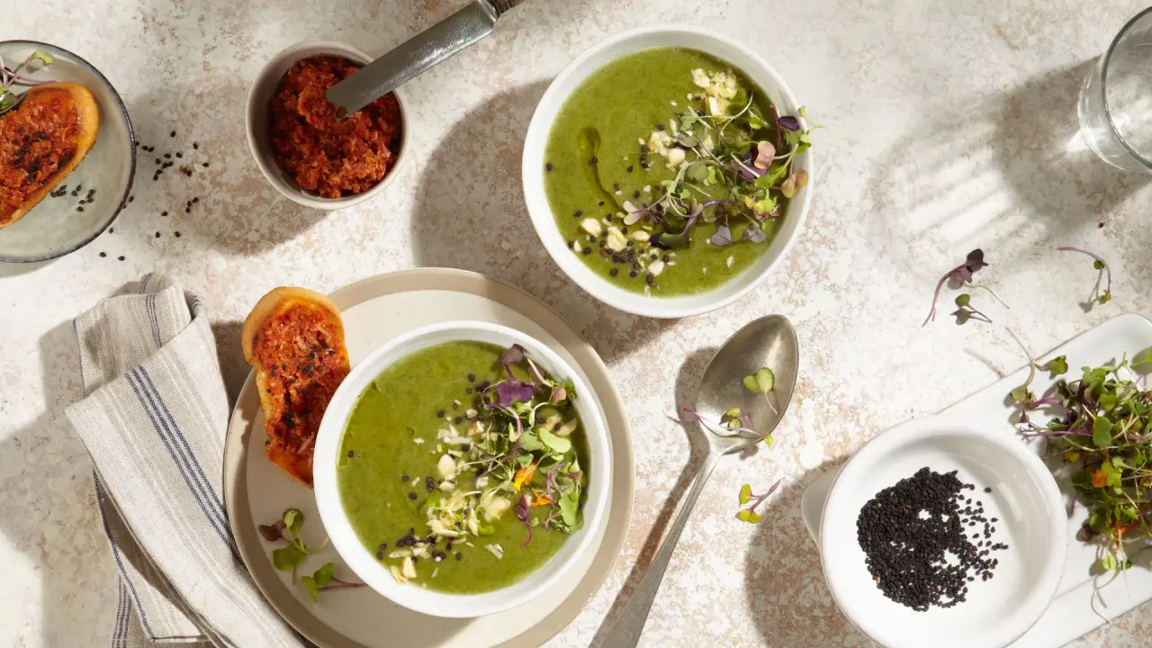Spring soups tend to feel lighter, but still full of flavour. This Chard Vichyssoise with Sun-Dried Tomato Crostini is a good example — a fresh take on a classic.