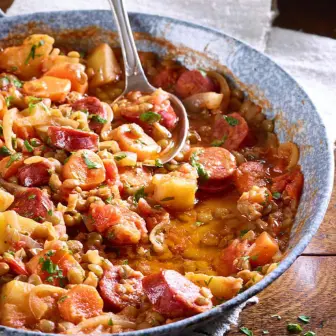 Lentil, chorizo and vegetable stew. This Spanish stew is the perfect winter warmer.